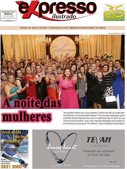 Hoje é dia de Expresso com edição especial falando da festa do colunismo social Acontece. O jornal está todo colorido e mais enfeitado ainda pelas belas mulheres de Santiago e região que foram destaque na grande noite do sábado passado;