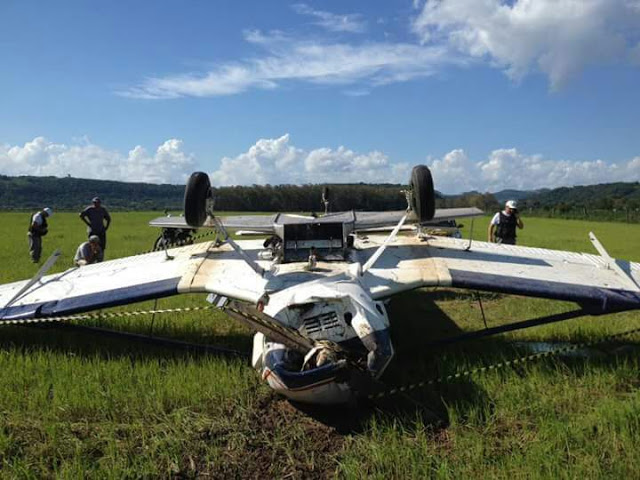 Um avião agrícola com dois tripulantes caiu na localidade de Vila Clara, interior de Mata. O acidente foi na tarde desta quinta, 01,  perto de uma lavoura de arroz, a poucos metros da pista. O piloto Moacir Moro e o copiloto Clóvis Dornelles da Silva foram socorridos e levados ao Hospital de Santa Maria, onde permanecem em observação. (foto: Álvaro Taschetto)