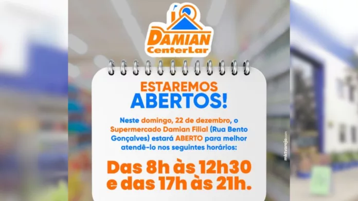 Neste domingo (22), o Supermercado Damian Filial (Rua Bento Gonçalves) estará ABERTO para melhor atendê-lo nos seguintes horários: