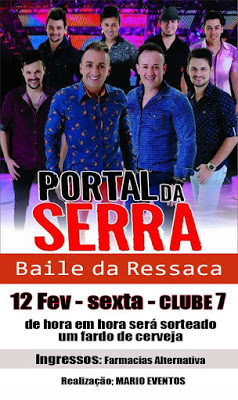 Santiago – Mário Eventos convida para o tradicional baile no Clube Sete nesta sexta com a banda Portal da Serra, pela primeira vez em Santiago. De hora em hora será sorteado um fardo de ceva. Ingressos antecipados na Farmácia Alternativa ou no carro de som.