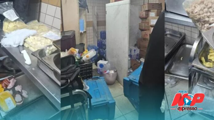 Os alimentos estavam sendo preparados e armazenados dentro de um banheiro. A dona do buffet e uma pessoa responsável pelo local foram detidas em flagrante por crime contra as relações de consumo.