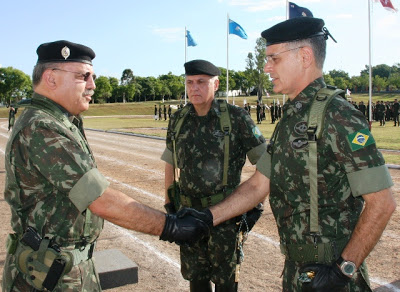 | O general Westphalen, da divisão de Exército, cumprimenta os generais Eustáquio (que vai para o Rio) e Stumpf (ao fundo) que chega para comandar todas as unidades em Santiago. |