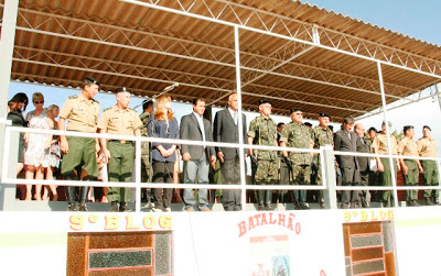 | Foi a primeira solenidade militar em que as autoridades civis acompanharam a cena por trás, sem a visão direta da troca de comando. Preferiram ficar à sombra a ter que pegar o sol no rosto. E estava quente! |