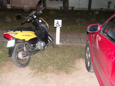 De que adianta a URI fazer o correto, demarcando espaços nos estacionamentos para cadeirantes e idosos? Sempre vai existir um apressadinho ou mal educado, como o dono ou dona desta moto, que vai estacionar na primeira vaga que encontrar, pouco se lixando se um deficiente físico vai ter que voltar pra casa e perder sua aula por não conseguir estacionar.