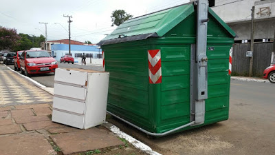largando ao lado de um contêiner, como fosse obrigação do pessoal da coleta