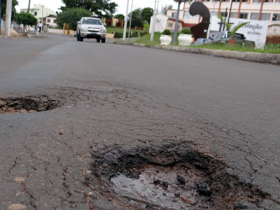 Depois de ter sido remodelada e asfaltada, a avenida Sete de Setembro tornou-se um cartão-postal em Santiago, além de ser um dos principais acessos à cidade. Mas já tem gente reclamando que o asfaltamento feito há um ano já está esburacando em alguns pontos, como mostra a foto acima, perto da escola Thomás Fortes.