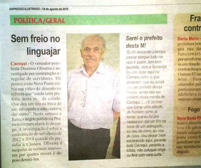 Cacequi – Na edição desta sexta, 14-08, o jornal Expresso publicou (na página 17) a foto do advogado Carlos Alberto Goerche em matéria que se refere ao vereador Dionísio Oliveira, conforme mostra a foto da página do jornal. De antemão a direção do jornal Expresso pede escusas ao dr. Carlos Alberto Goerche, digníssimo procurador jurídico de Cacequi e esclarece que o erro foi cometido por um dos nossos paginadores que trocou a foto na hora de compor a página. Também informa que está tomando todas as medidas por meio de sites, redes sociais, rádios e no próprio Expresso para corrigir o erro cometido.