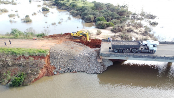 A cheia do rio causou o rompimento da cabeceira da ponte, que agora está sendo recomposta com cargas de pedra para permitir a retomada do tráfego.
