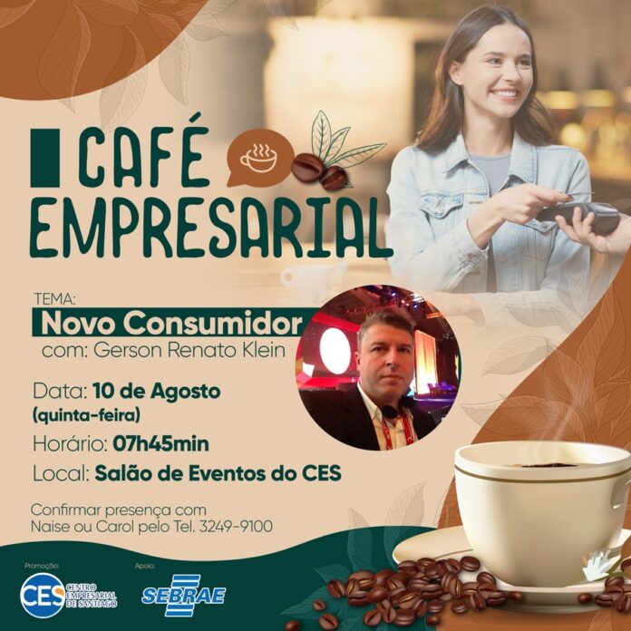 Na próxima quinta-feira, 10/8, o Centro Empresarial de Santiago (CES), em parceria com o Sebrae, promoverá um Café Empresarial. O tema da palestra será “O Novo Consumidor” e terá como palestrante o administrador Gerson Renato Klein. Devido aos lugares serem limitados, o CES solicita agendamento prévio através do fone 3249.9100 com Naíse ou Carol. O evento está marcado para as 7h45min.