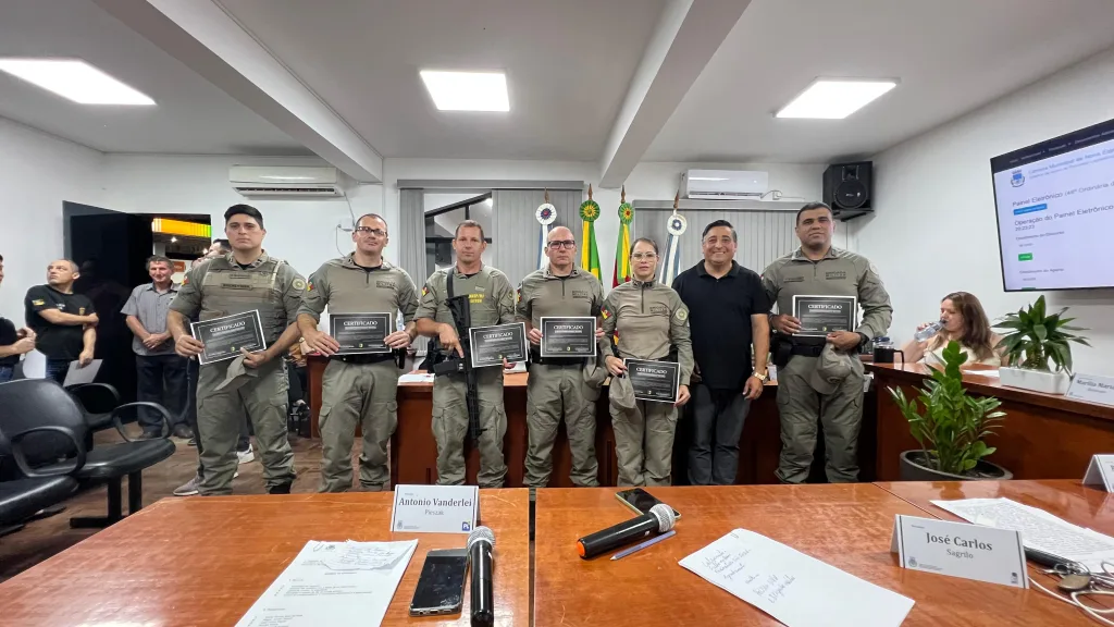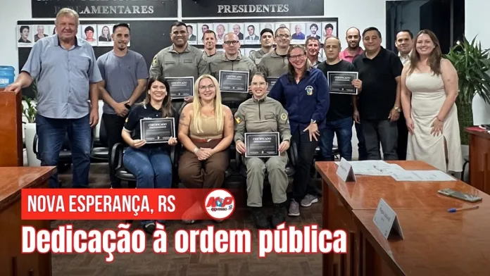 Nova Esperança do Sul, RS – A Câmara entregou, na última segunda (22/12), uma Moção de Congratulações a dez policiais militares do 5º RPMon. A homenagem, proposta pelo vereador Paulo Roberto Machado Mayer e aprovada por unanimidade, reconhece o comprometimento da equipe com a segurança pública local.