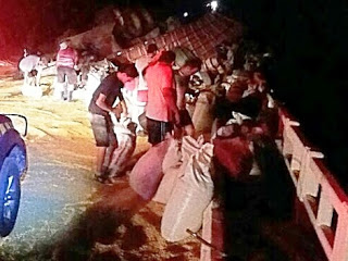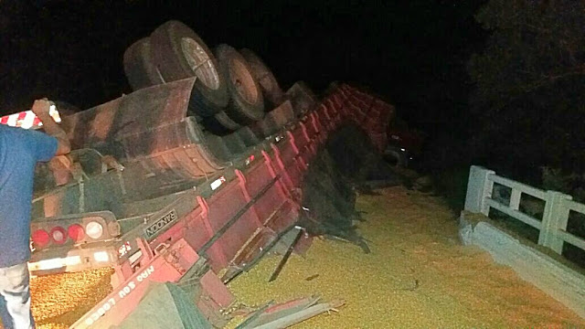semirreboque, derramando toda a carga sobre a pista.