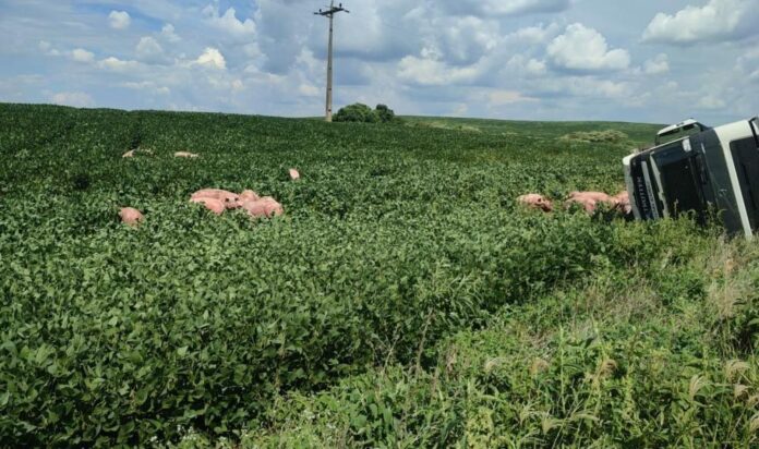 O caminhão que transportava os suínos saiu da pista e tombou em uma plantação nas margens da rodovia.