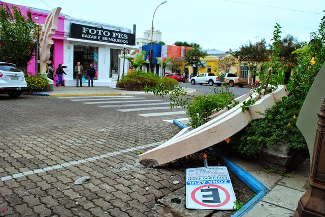 Santiago- É uma uma pena, mas um dos monumentos da Rua dos Poetas foi derrubado na manhã desta sexta-feira. Uma das duas partes do pórtico das penas, que simboliza a literatura, caiu depois que o caminhão que recolhe os contêineres de lixo acabou batendo, ao cruzar pela esquina com o guincho aberto, voltado para a calçada, derrubando o monumento. A Prefeitura deverá providenciar o conserto e cobrar a responsabilidade pelo dano ao patrimônio público.(fotos; Éder Alves-Expresso/Nova Pauta).