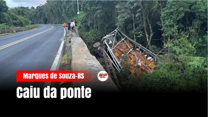 Marques de Souza – RS – (Região de Lajeado) – O caminhoneiro que levava uma carga de perus para Passo Fundo ficou gravemente ferido depois de sair da pista e cair ao lado da ponte sobre o Arroio Tamanduá, na BR-386. O acidente aconteceu durante a madrugada desta quinta-feira.