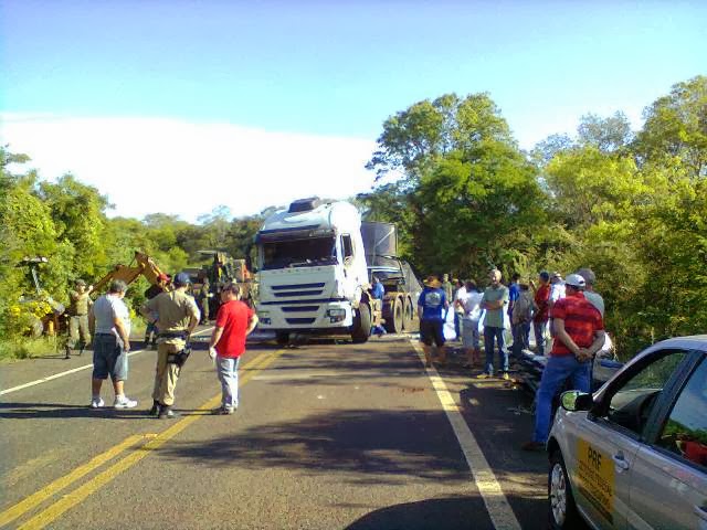 Na manhã de segunda o motorista desta carreta levou um grande susto perto de Unistalda. A carga tombou para o lado e ele não conseguiu evitar que o caminhão virasse no acostamento. A carga de adubo ficou esparramada na pista mas o caminhoneiro não se machucou. Uma retro da prefeitura ajudou na limpeza da pista.