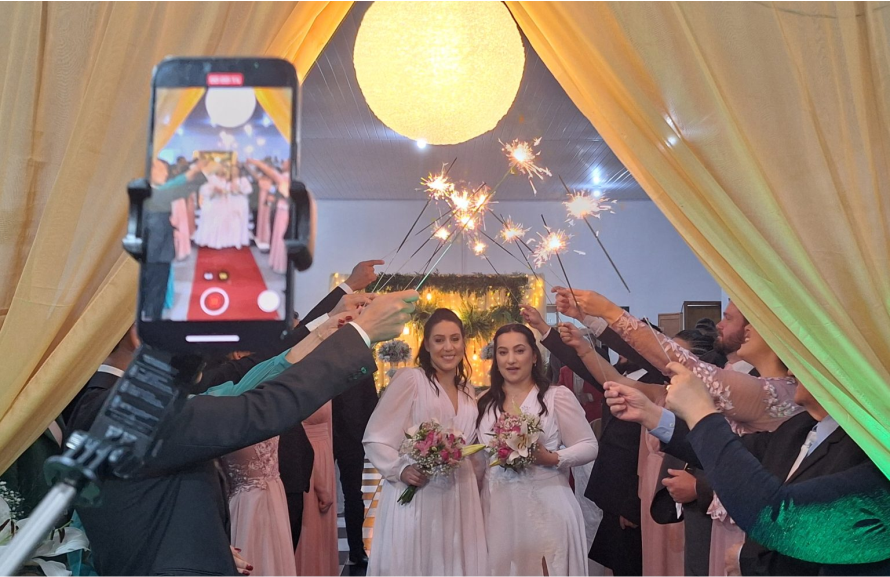 A cerimônia foi em um salão de festas no bairro Centenário. Elas entraram acompanhadas dos pais, com os padrinhos, e sob o olhar dos convidados celebraram a união com o casamento.