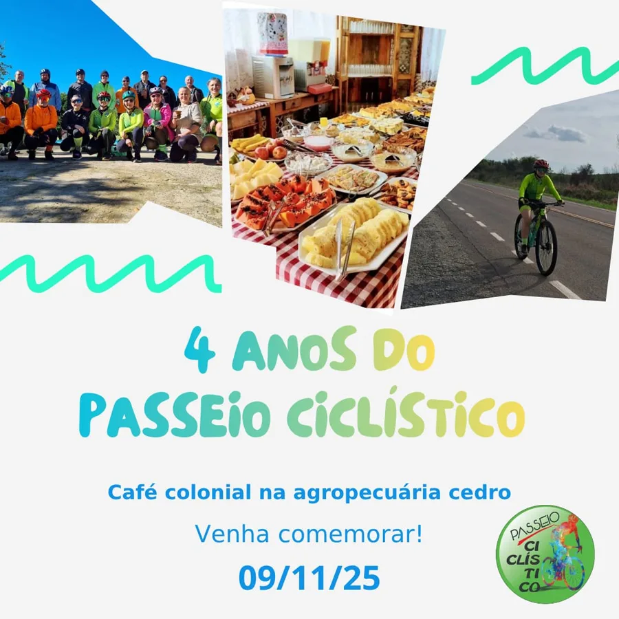 Santiago/RS – O grupo Passeio Ciclístico de Santiago completa quatro anos de atividade e a comunidade é convidada a celebrar neste domingo, 9 , com um pedal de aniversário especial.