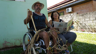 Paulo Ademir do Nascimento Silva, 54 anos, está desde os 42 em uma cadeira de rodas. A causa foi um tiro na espinha disparado por um assaltante quando trabalhava em uma fazenda. Acostumado com as lidas de campo, hoje passa o tempo fazendo rédeas, arreios, relhos e outros trabalhos em couro. A esposa e companheira Ilhete Silva, é quem lhe dá suporte para enfrentar os problemas. Quando está acabrunhado, ela dá de mão no Expresso, lê pra ele e a tristeza vai embora! O casal mora na rua José João Saldanha, em Manoel Viana e não perde um Expresso.