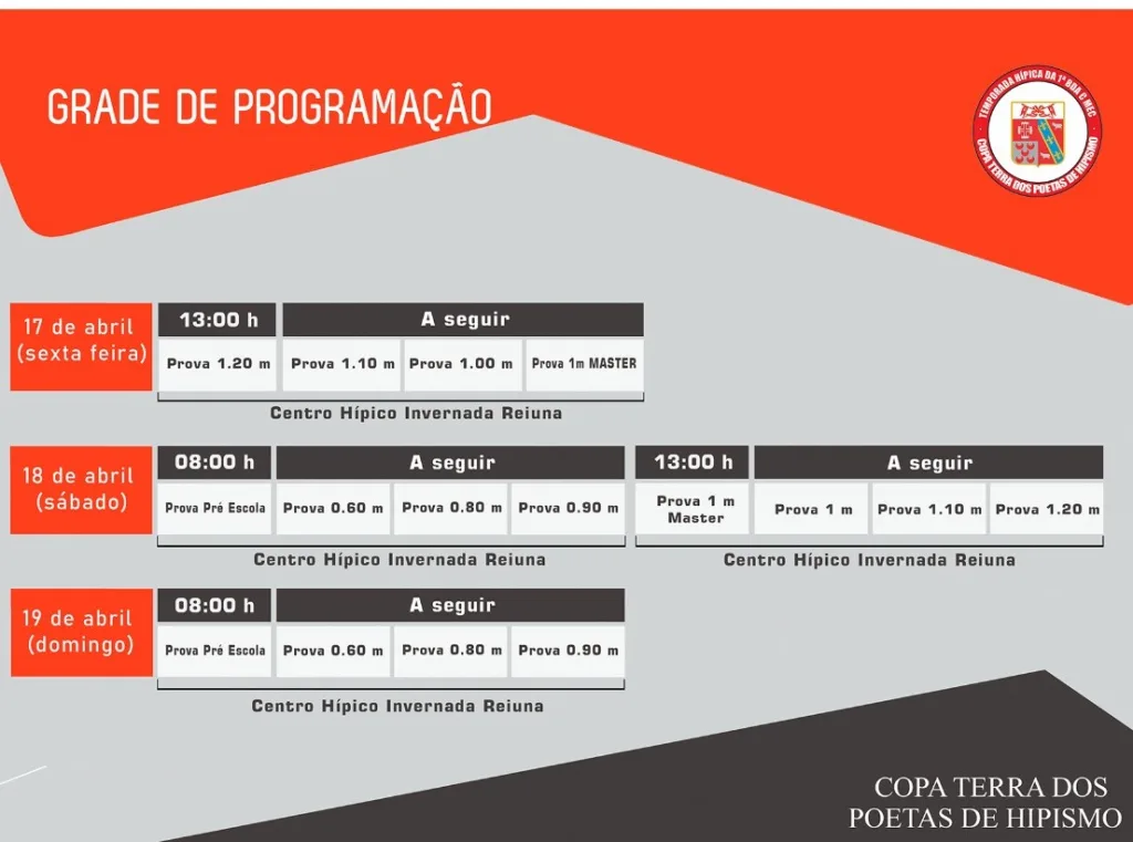 A programação iniciou nesta sexta-feira, às 13h, com provas de 1,20m, 1,10m, 1,00m e 1m Master. No sábado (18), as atividades começam às 8h com Pré-Escola, além das provas de 0,60m, 0,80m e 0,90m. À tarde, a partir das 13h, ocorrem as provas de 1m Master, 1m, 1,10m e 1,20m. No domingo (19), a programação recomeça às 8h com Pré-Escola e segue com as categorias de 0,60m, 0,80m e 0,90m, encerrando o evento.