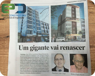 “A Ello Construtora é notícia no jornal Expresso já que o projeto de reforma desse prédio na Pinheiro Machado estava despertando curiosidade em Santiago. Então, a equipe do jornal nos procurou para divulgar em primeira mão. Em breve , mais detalhes deste projeto.” A direção da construtora.