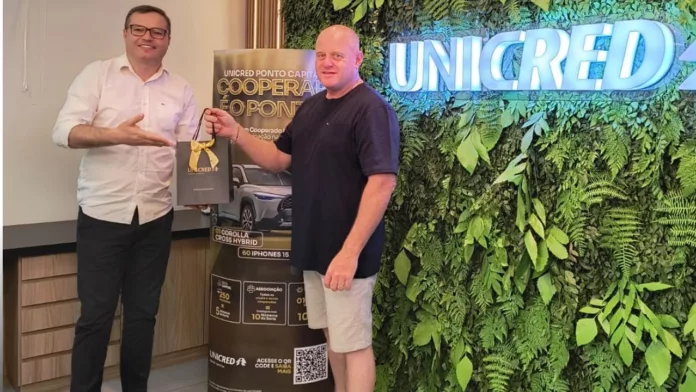 A Unicredi Santiago entregou, nesta semana, mais um iPhone 15 sorteado na campanha “Cooperar é o ponto”. O ganhador do terceiro sorteio foi o associado Gustavo Madalosso. Ele, assim como os demais cooperados, continua concorrendo ao prêmio principal: um Toyota Corolla Cross Hybrid, que será sorteado em 2025. Antes disso, haverá mais um sorteio de um iPhone em fevereiro.