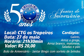 Santiago – O Cruzeiro promove neste sábado, 27, um jantar-bingo em comemoração aos seus 50. O evento será nos Tropeiros, às 21h30. Haverá sorteio de brindes. No cardápio: galeto, arroz (branco e à grega) maioneses, saladas e pão. Cartões a 20 reais, à venda com a diretoria, na secretaria do clube e no CTG (à tarde ou na hora do evento). Reservas:3251-2062.