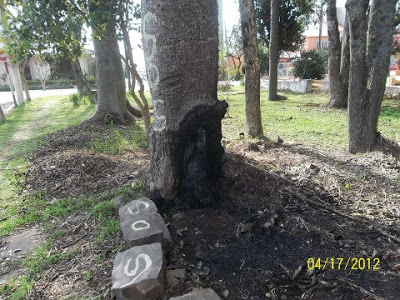 No bairro Jardim das Paineiras, em Santiago-RS, um idiota criminoso está colocando fogo no tronco de uma árvore e há indícios de que outras também seriam queimadas. O local é um terreno de esquina, famoso pelas imensas e belas Paineiras (Ceiba speciosa) que ali estão há anos. Tempos atrás cogitou-se a possibilidade de transformar o lugar numa praça municipal, pena que a ideia não foi levada adiante…