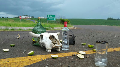 Capão do Cipó – Ontem a equipe do Expresso se surpreendeu com as “oferendas” no trevo ou encruzilhada de acesso a Capão do Cipó. O fato de haver bebidas, frutas, sementes, galinhas e velas é algo normal, pois seriam oferendas aos orixás. Agora, a carcaça de cabeça de boi aí no meio é uma raridade. Por isso, alguns acreditam que seja algo para espantar o excesso de chuva.