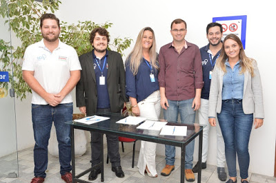 Os extensionistas do NEPI, Lucas Sudati, Yuri Perufo, Liane Gavioli e Raphael Garcia, junto da coordenadora do projeto, Francine Gorski, recepcionaram os convidados, que lotaram o auditório.