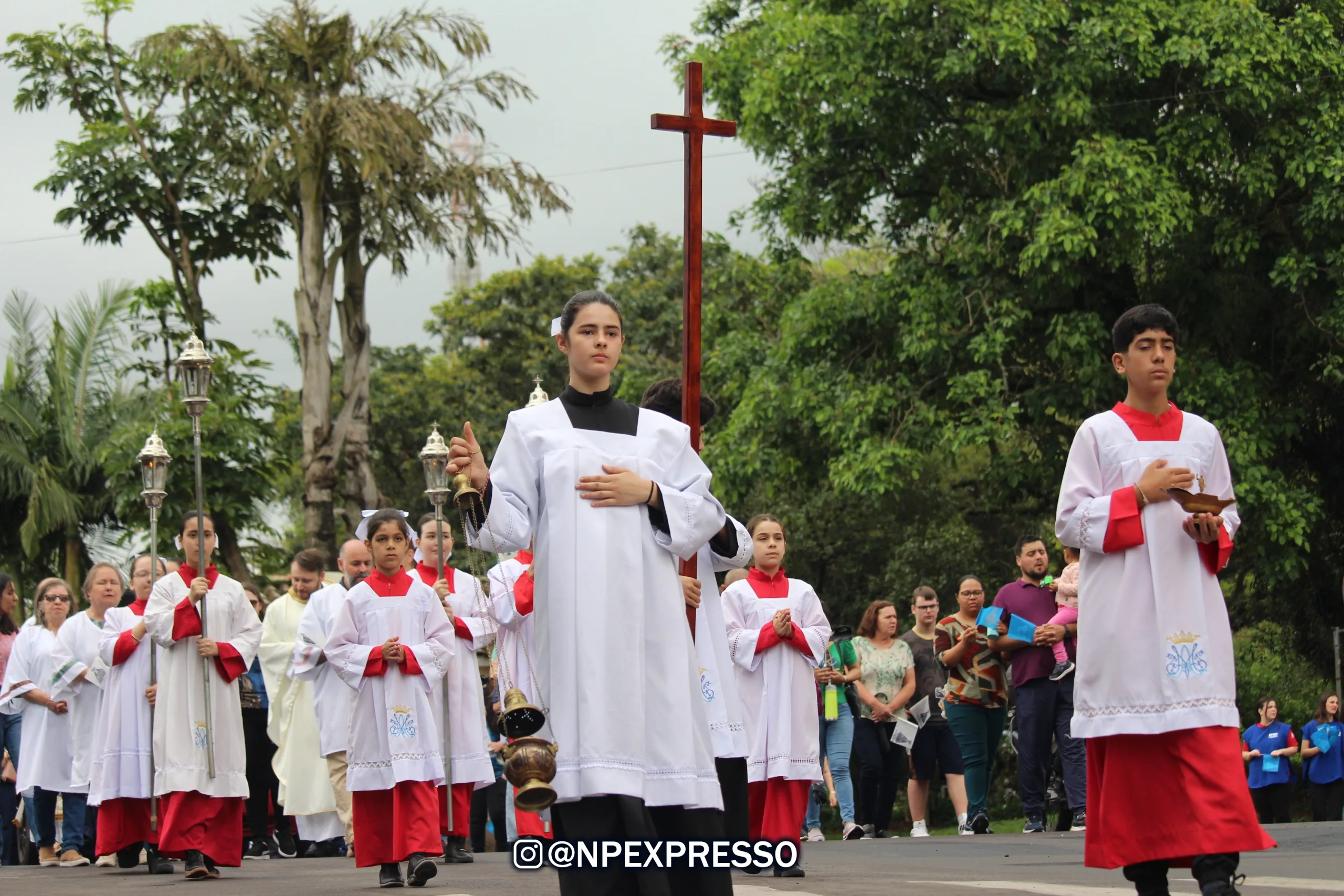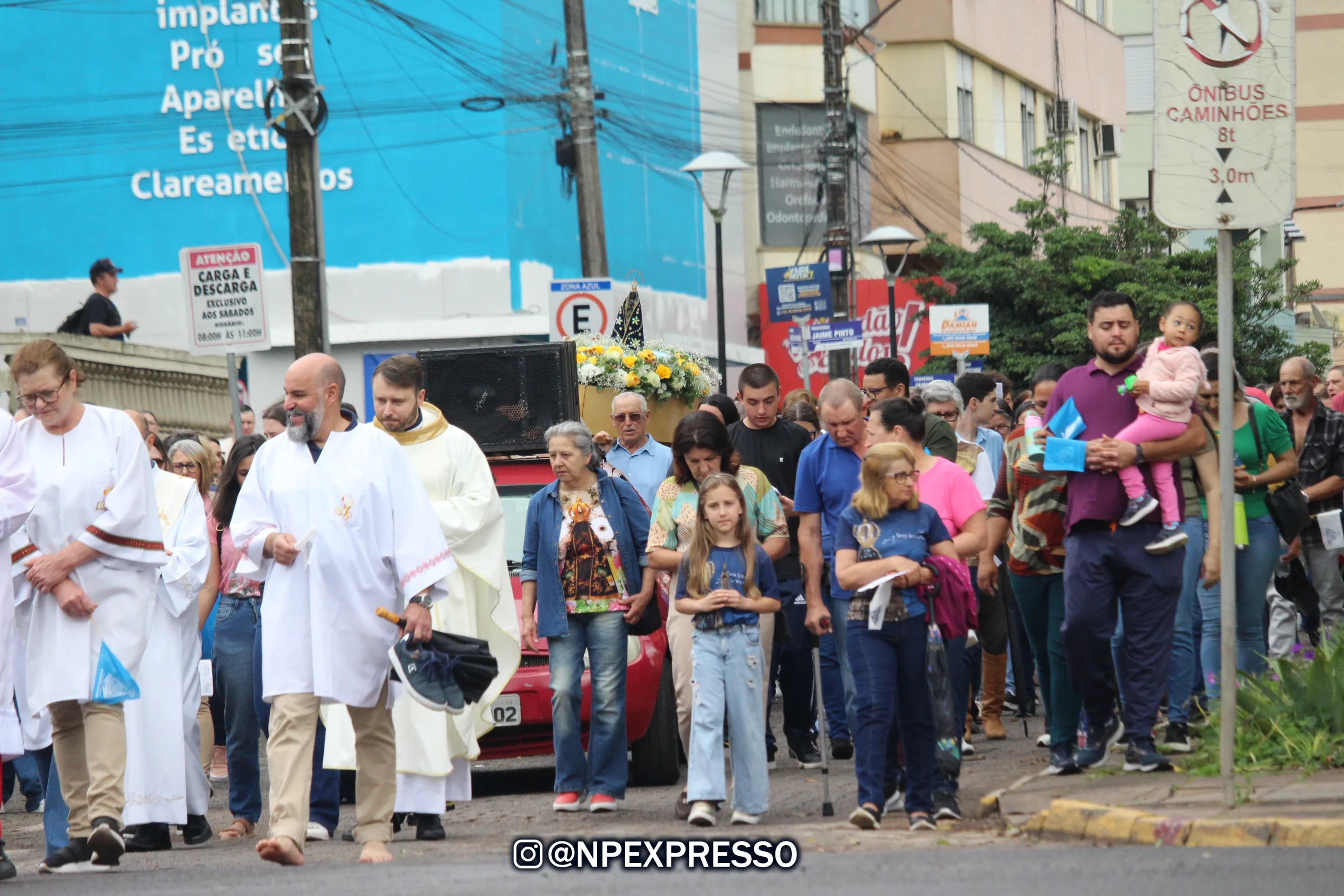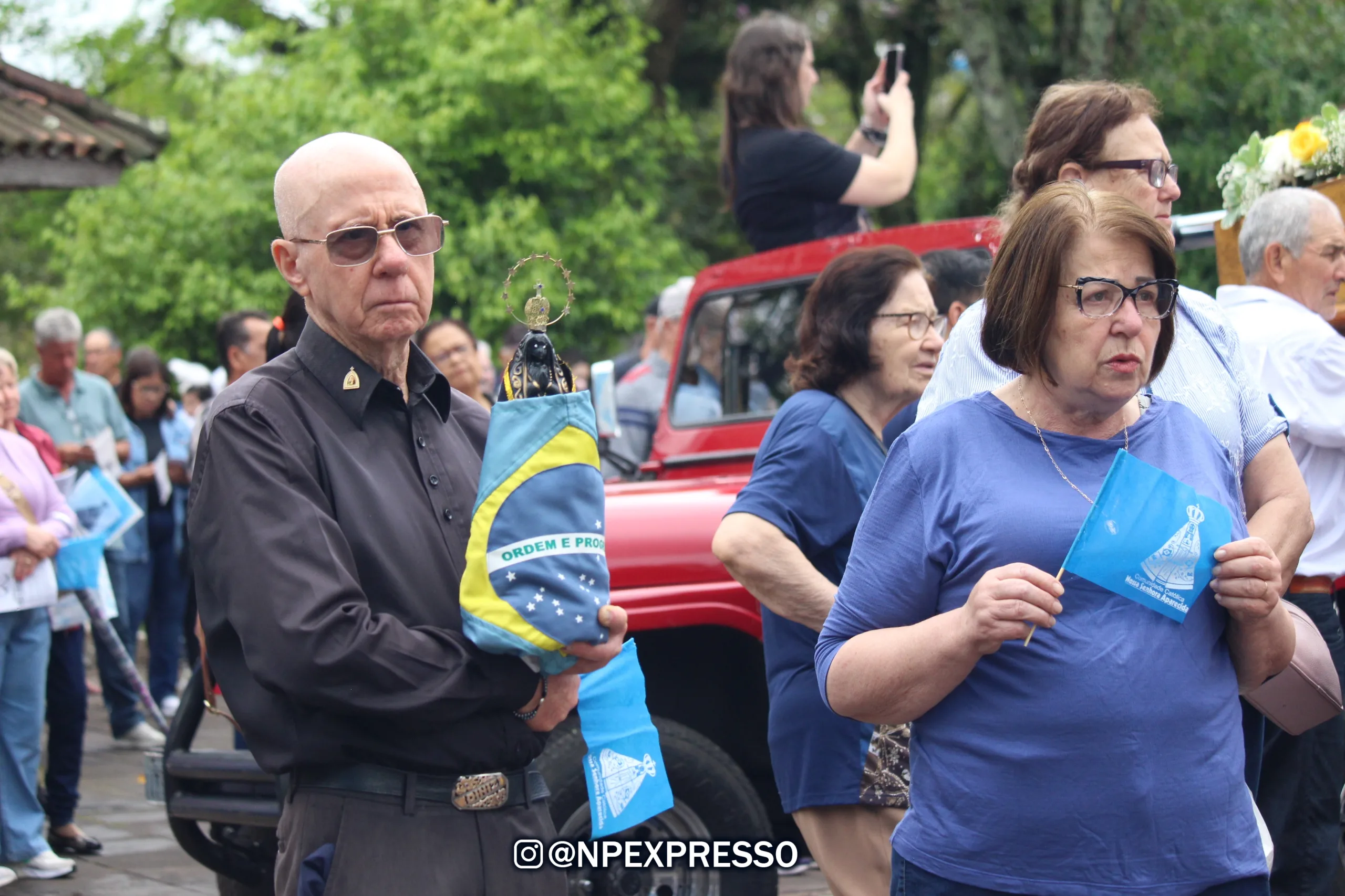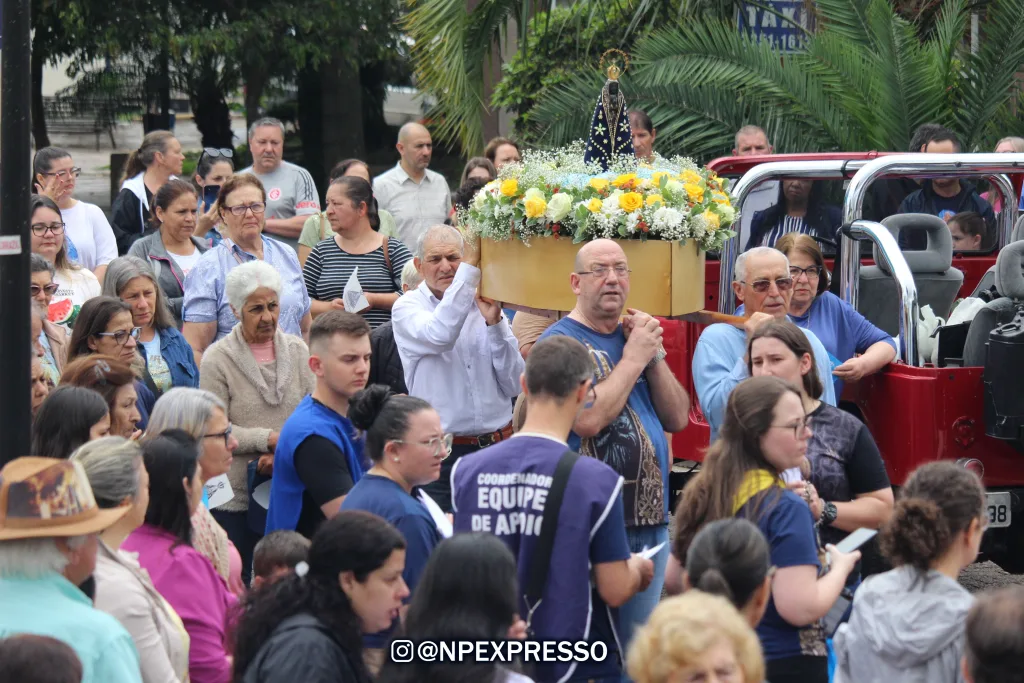 Na sequência, a procissão seguiu a pé da Igreja Matriz até a Capela Nossa Senhora Aparecida, no bairro Santiago Pompeo. A programação no local inclui missa, almoço e festejos populares durante a tarde.