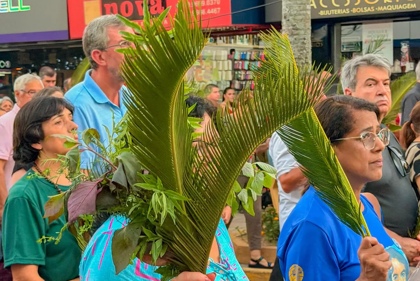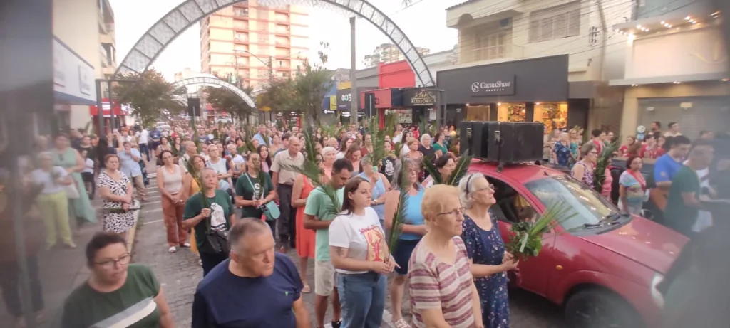 Santiago, RS – Centenas de santiaguenses participaram da procissão de Domingo de Ramos, promovida pela Paróquia Nossa Senhora da Conceição com apoio da secretaria de Turismo e Cultura. O elenco da encenação da Paixão de Cristo acompanhou o padre Aodomar Wandsher pelo Calçadão, onde a decoração temática da Semana Santa motivou a reflexão sobre o sentido da data.