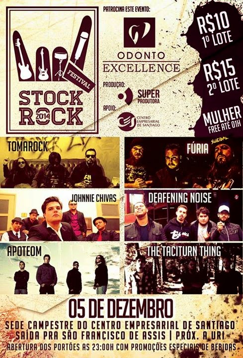 Nos dias 05 e 06 de dezembro, a SuperProdutora fará dois eventos alternativos para quem gosta do bom e velho rock n’ roll. No dia 05, acontece o Stock Rock Festival 2014, com as bandas TomaRock (de Santiago), Johnnie Chivas (São Borja), Apoteom (Santa Maria), Fúria (Santa Maria), Deafening Noise (Santiago) e The Taciturn Thing (Santiago). Os ingressos custa 10 e até a 1h as mulheres não pagam.