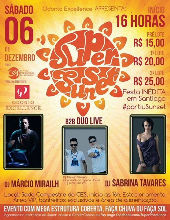 Faça chuva ou sol– Para fazer festa não tem hora, certo? E que tal uma festa que começa às 4 da tarde sem hora para terminar? A SuperProdutora fará a Super Sunset, com Dj’s que vão tocar o melhor da música eletrônica. Participação de Márcio Mirailh, Sabrina Tavares e B2B Duo Live. Os dois eventos serão Será na sede campestre do Centro Empresarial, na saída para São Chico. Haverá grande estrutura de tendas e pirâmides, praça de alimentação e estacionamento.
