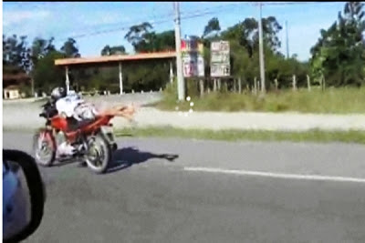 A imprudência em alta velocidade de um motociclista na BR-101 em Garopaba, no litoral de Santa Catarina, colocou em risco a sua vida e a de outros. O veículo estaria a cerca de 140km/h e para diminuir o atrito com o ar e ganhar ainda mais velocidade, o motorista, de pés descalços, deitou-se sobre a moto. Quando percebeu que estava sendo filmadosentou na moto, diminuiu a velocidade e foi para o acostamento.