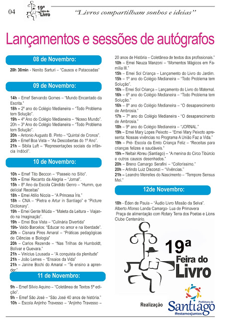A 14ª Feira do Livro de Santiago já está atraindo muita gente para a Estação do Conhecimento. A abertura aconteceu na manhã desta quinta-feira, com a presença de livreiros, escritores e autoridades civis e militares. Teve apresentação da banda do Exército e homenagem à patrona Fátima Friedriczewski. A feira está com 15 estandes e tem livros para todos os gostos. Prossegue até o domingo, com uma programação variada, com lançamentos de livros, atrações musicais, dança, bate-papo com escritores, sessões de cinema, campanha Outubro Rosa, exposições e muito mais.