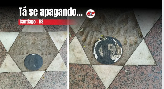 Santiago – RS – (Terra dos Poetas) – No coração da Rua dos Poetas, a Calçada da Fama deveria ser um livro aberto sobre a grandeza cultural de Santiago. Inaugurada em 2012, ela nasceu com o propósito nobre de imortalizar artistas, escritores e personalidades que levaram o nome do município para além de suas fronteiras. No entanto, 14 anos depois, o que se vê é o avanço implacável do tempo sobre o metal e a pedra. A exposição contínua ao sol forte e às chuvas minuana acelerou o desgaste, e hoje, o visitante que caminha pelo local encontra dificuldades para ler os nomes dos primeiros homenageados. A memória, literalmente, está desaparecendo.
