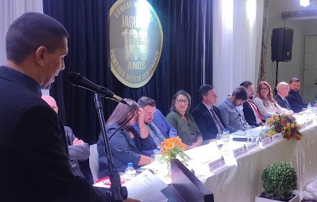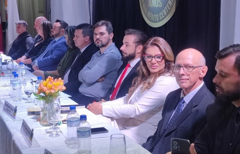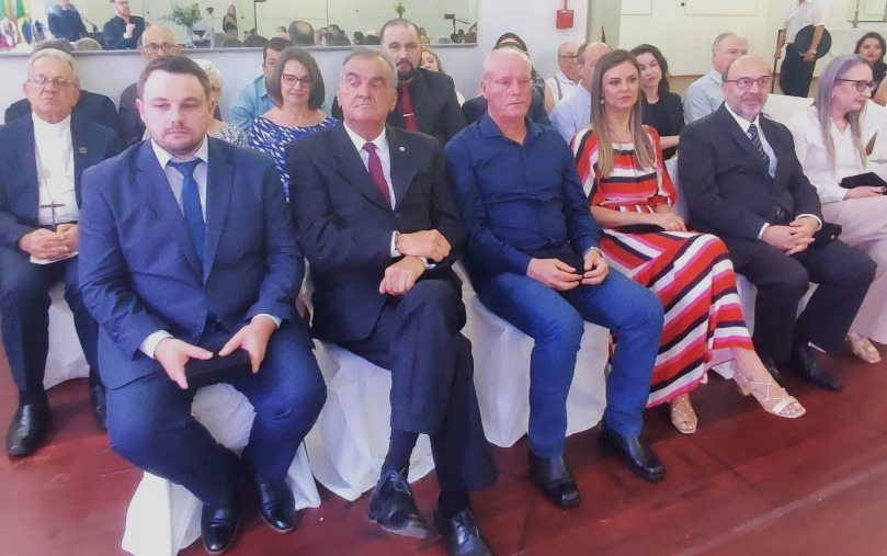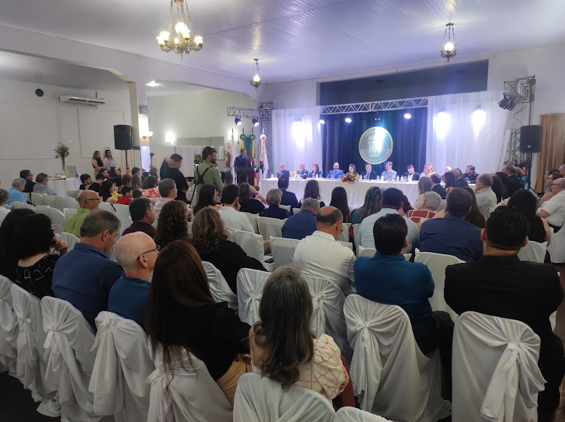 O Clube União ficou lotado para mais uma sessão solene promovida pela Câmara de Vereadores, sob a liderança da presidente Elenice Cattelan. Registramos a presença de várias autoridades, além dos vereadores, a exemplo do prefeito Beto Turchiello e do vice-prefeito Lucas Cattelan.