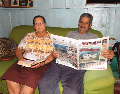 Manoel Viana – Maria Garrot, 75 anos, e o esposo Remício Garrot Pinheiro, 83, são assinantes desde 2013. “A primeira coisa que fizemos é ler a bíblia e depois o Expresso. Assim ficamos sabendo de tudo o que acontece em nossa cidade e região, pois não temos rádio e nem televisão. O Expresso pra mim é completo, gosto das charges e das sessões da Câmara”, diz dona Maria. Já o seu Remício conta que também é fã do jornal e gosta das matérias da cidade. O casal mora na rua Tirteo da Rocha Viana. Eles tem 12 filhos, 22 netos e 7 bisnetos.