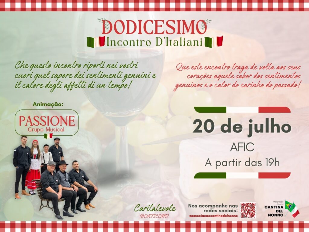 Nova Esperança convida para a maior festa gastronômica da região. A 12ª edição do Dodicesimo Incontro d’Italiani será no próximo dia 20 de julho, na AFIC. Neste ano, o evento terá caráter beneficente e busca resgatar a cultura italiana no Vale do Jaguari, através de suas manifestações artísticas, gastronômicas e culturais. A promoção é da Associação Cultural Italiana de Nova Esperança, Cantina Del Nonno, em parceria com a Prefeitura.