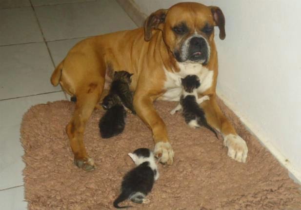 Quatro gatinhos abandonados em um terreno foram levados esta semana a uma propriedade rural onde serão criados. A história não teria destaque maior não fosse o fato de que os gatos foram salvos por um cão. Durante um passeio, Aquiles, da raça Boxer, entrou em um terreno baldio. Pouco depois reapareceu trazendo na boca uma sacola plástica. O dono acreditou que se tratasse de restos de comida. “Até ralhei com ele, mas o Aquiles continuou vindo, soltou a sacola nos meus pés e ficou eufórico. Quando desatei a sacola, vi que eram quatro gatinhos.” Ele então levou os animais para casa e o cão deitou ao lado dos filhotes e passou a lambê-los.