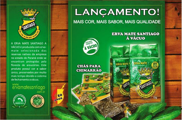 Em breve a ervateira Santiago irá completar 20 anos e para festejar a data acaba de lançar novos produtos. Um deles é a erva-mate Santiago embalada a vácuo (sem açúcar) produzida com matéria-prima selecionada das reservas nativas da própria empresa no Paraná e que são protegidas pelas florestas de araucárias. Também está sendo lançada a linha de chás para chimarrão, composta por quatro tipos diferentes: Chá para chimarrão; chá para chimarrão com laranja; chá para chimarrão de anis estrelado e chá para chimarrão de camomila. Feitos com matérias-primas selecionadas e certificadas os chás podem ser adicionados diretamente na cuia ou na térmica. Os novos produtos chegarão às prateleiras dos pontos de vendas ainda no mês de julho.