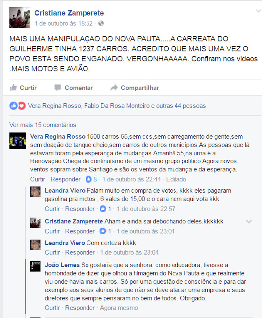Santiago – Faço uma pequena explicação sobre muitos ataques que recebemos. Não somos de responder, mas este, por se tratar de uma ofensa vinda de célebre professora (Cristiane Zamperete) merece uma resposta.