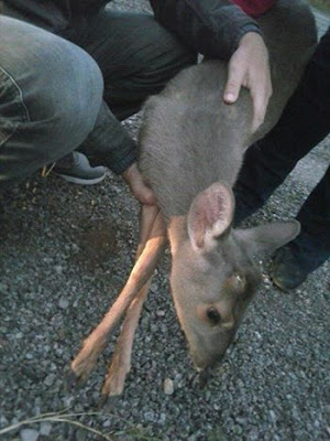 Santiago – De tanto que as leis tentam proteger a caça, algum efeito talvez já se note. Seguidamente se vê animais em nossos campos e até atravessando as rodovias. Vez por outra, uma mulita, uma paca, capivara ou até um veado se dá mal com os carros. Este foi atropelado na RS 377, entre Santiago e Capão do Cipó. Por sorte, o bichinho foi resgatado por Elisandro Ribeiro, Rose Brum e Álvaro Chagas. O coitado estava desnorteado, mas sem ferimentos graves. Passadas algumas horas, recuperou-se e seguiu para seu habitat. (Noticiado por Thiago Ramos).