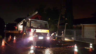 Santiago – Seja dia ou seja noite, lá estão os técnicos da RGE a enfrentar chuva, vento, calor ou frio para não deixar faltar energia para todos nós. Devido ao vendaval que atingiu Santiago nesta quarta,22, essa equipe e outras tantas vão cruzar a noite trabalhando. Essa foto foi tirada às 22h na Benjamin Constant, bairro Maria Alice.