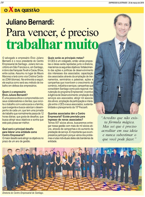 O CES é um colegiado, então várias propostas e ideias serão lapidadas, mas temos os seguintes objetivos: fortalecimento das ações e políticas de desenvolvimento dos interesses dos associados; capacitação dos associados, seminários e palestras; ações e campanhas que incentivem o crescimento do comércio, indústria e serviços; campanhas que consolidem Santiago como polo regional; manutenção do programa Empreender; incentivo à Agência de Desenvolvimento; ampliação dos serviços aos associados; atingir mil associados ativos; ampliação da participação e interação entre o CES e seus associados; sustentabilidade e planejamento da 15ª Fecoarti.