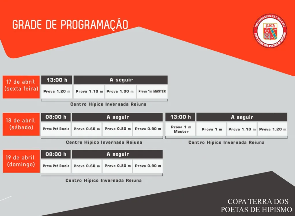 Na sexta-feira, 17, as disputas começam às 13h com provas de 1,20 metro e 1,10 metro. Na sequência, haverá as provas de 1 metro e 1 metro Master. No sábado, 18, a programação inicia às 8h com Pré-Escola, 0,60 metro e 0,80 metro. Depois, seguem as provas de 0,90 metro, 1 metro Master, 1 metro, 1,10 metro e 1,20 metro.