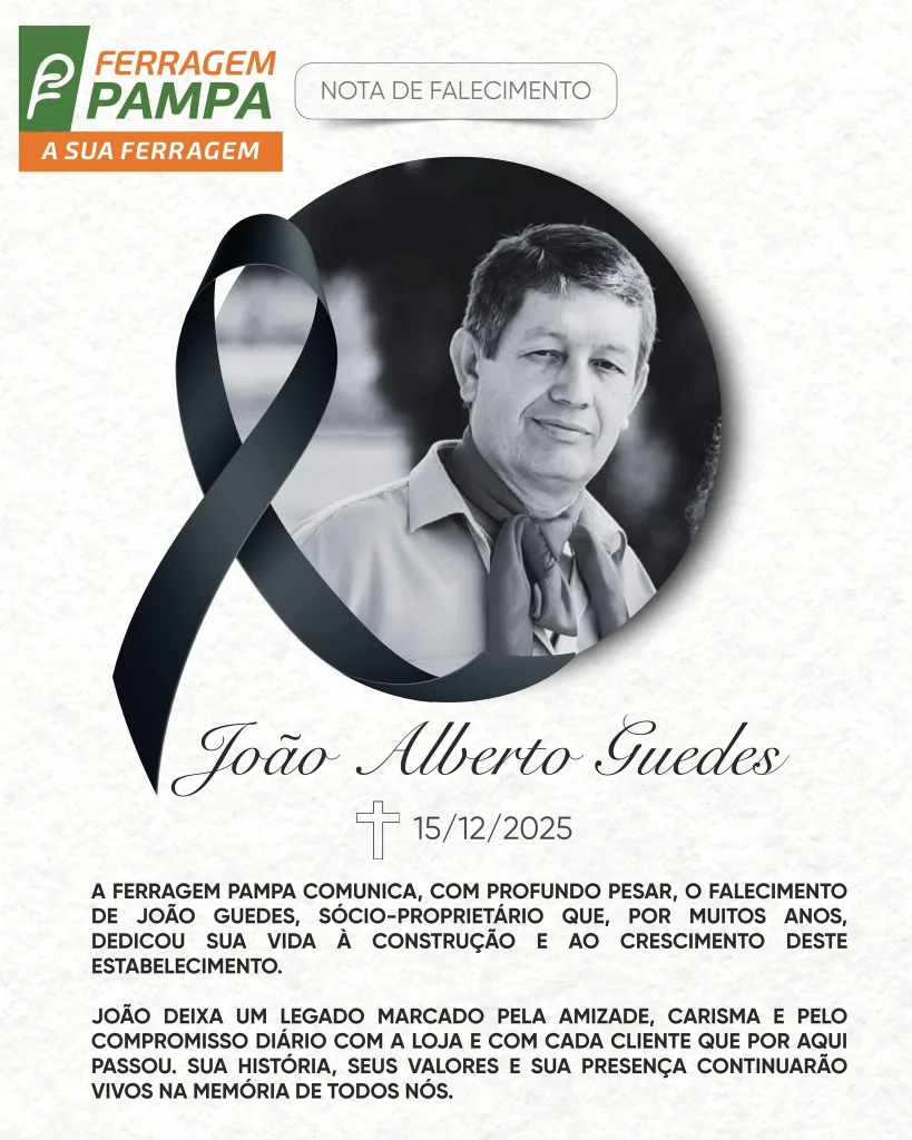 A Ferragem Pampa comunicou o falecimento “com profundo pesar”, destacando que João Guedes dedicou muitos anos de sua vida à construção e ao crescimento do estabelecimento.