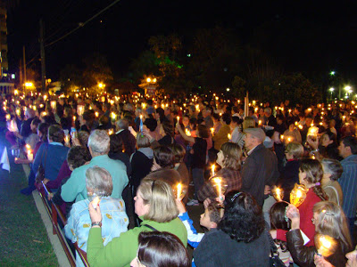 Estima-se que mais de mil pessoas participaram de uma procissão com velas que percorreu várias ruas centrais de Santiago, na noite desta terça-feira. O ato religioso reuniu várias comunidades católicas durante a programação das missões redendoristas e culminou com uma missa campal em frente da Igreja Matriz. Participaram da cerimônia, o bispo diocesano Dom Aluíso, acompanhado de onze missionários.