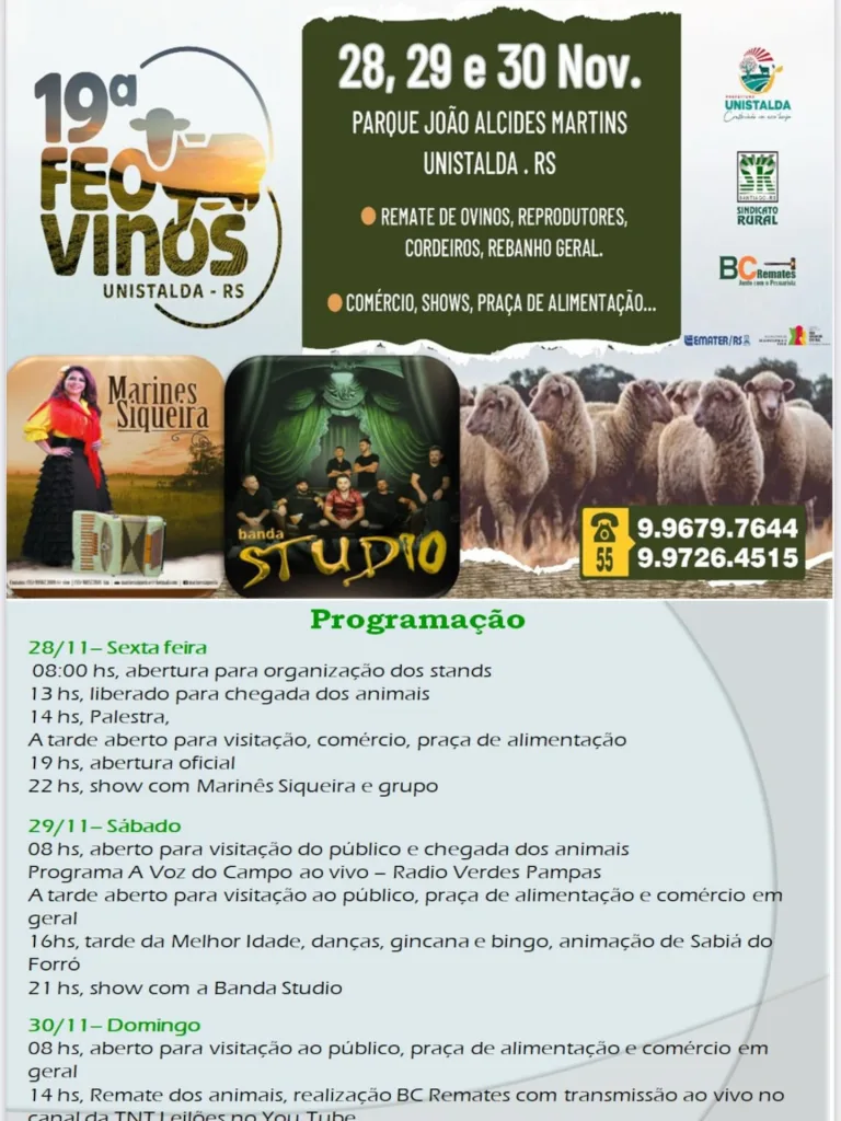 Unistalda – De 28 a 30 de novembro, o município promove mais uma edição da Feovinos no Parque de Exposições João Alcides Martins, às margens da BR-287. A feira, que chega à sua 19ª edição, reunirá o que há de melhor na genética ovina da região, com remates de reprodutores, cordeiros e rebanho geral. Além do setor pecuário, a Feovinos também oferece uma ampla programação cultural, com exposição comercial, shows e praça de alimentação, entre outras atrações.