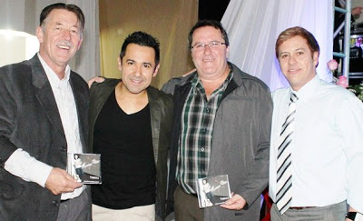Os empresários Neri Guerra, Diógenes Pohl e João Lemes com o cantor Henrique Dilan (centro).